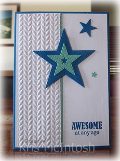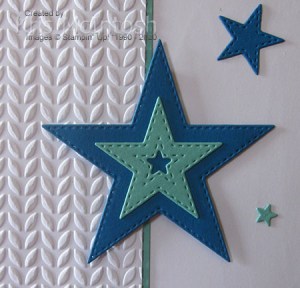 Today’s card is inspired by the many cards on Pinterest using the Stitched Stars Dies. I began by stamping the greeting from the Itty Bitty Birthday stamp set onto the lower right hand corner of Whisper White card using Pacific Point card. I embossed Whisper White card using one of the Greenery Embossing Folders and attached a narrow strip of Coastal Cabana card behind the right hand edge. The embossed panel is attached to the left hand side of the stamped Whisper White card.