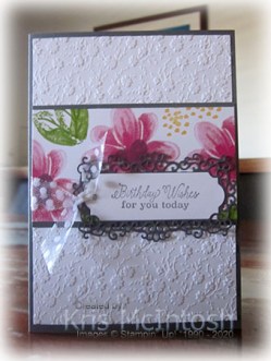 Today’s card, once more, uses the really beautiful Gorgeous Posies stamp set. I can’t believe I waited so long to get this stamp set! I used a sketch challenge at Case This Sketch to create my card, although I did miss the challenge deadline. I stamped the flower from the Gorgeous Posies stamp set onto Whisper White card using Melon Mambo ink. I stamped the flower centre using Basic Gray ink. I stamped the leaf image around the flowers using Granny Apple Green ink. I also stamped the “dotted” image around the flowers and leaves using Daffodil Delight ink. I attached the panel to Basic Gray card and then Whisper White card which I had embossed using the Ornate Floral 3D Embossing Folder.