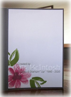 I punched a hole in one end of the greeting panel using my Crop-A-Dile. I threaded Whisper White Polka Dot Tulle Ribbon through the hole. I attached the greeting to the stamped panel and attached the ends of the Ribbon to the back of the embossed card. I used another piece of the Whisper White Polka Dot Tulle Ribbon to tie a knot around the previously attached ribbon. The whole panel is attached to scored and folded Basic Gray card. To decorate the inside of the card, I stamped the flower from the Gorgeous Posies stamp set onto the lower left hand corner of Whisper White card. I stamped the flower centre using Basic Gray ink and a couple of leaves using Granny Apple Green ink. This is such a pretty card, don’t you think?