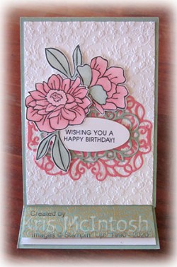 Today’s card is kind of CASED from a tutorial that I bought from Connie & Mary. I decided to change it up a little and create an easel card. I embossed Whisper White card using the Ornate Floral 3D Embossing Folder. The embossed card is attached to Mint Macaron card and then the Mint Macaron card base. I cut the large die from the Detailed Bands Dies from Flirty Flamingo card and attached it to the embossed Whisper White card. I cut the smaller die from the Detailed Bands Dies from Mint Macaron card and attached it to the Flirty Flamingo Die cut. I stamped the greeting from the Band Together stamp set onto Whisper White card using Memento Tuxedo Black ink and cut it out using the oval die from the Detailed Bands Dies. I attached the greeting to the centre of the die cuts using dimensionals.