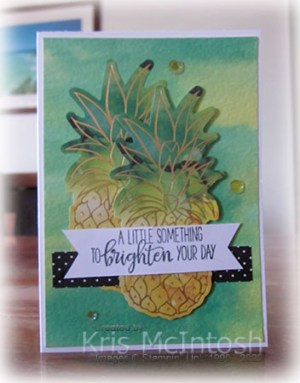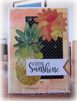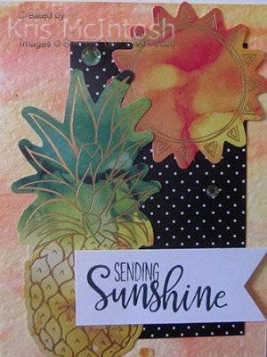 I attached a second pineapple using dimensionals. I stamped the greeting from the supplied stamp set onto Whisper White using Basic Black ink. I trimmed down the card and punched both ends using the Triple Banner Punch before attaching the greeting to the card front using dimensionals. To decorate the inside of the card, I attached a sun die cut and stamped another greeting from the supplied stamp set using Basic Black ink. I love the backgrounds on these cards, such a fun technique to play with and one I should use more often. I still have a few die cuts left from this kit so will share more cards soon.