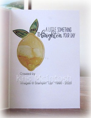 I stamped “Sunshine” and “sending” from the supplied stamp set onto Whisper White card using Basic Black ink. I trimmed down the Whisper White card and punched one end using the Triple Banner Punch. The greeting is attached to the card front using dimensionals. To decorate the inside of this card, I attached one set of die cut leaves and one lemon die cut.
