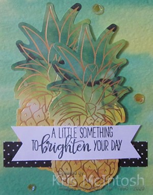 I also stamped another greeting from the supplied stamp set using Basic Black ink. For the Crushed Curry/Spruce card, I attached one pineapple die cut with a strip of the black and white card over the top.