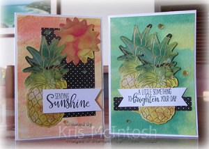 I let my paper dry over night and then trimmed each piece to fit on scored and folded Thick Whisper White card. For the Crushed Curry/Poppy Parade background, I added a large die cut piece of Black and White card. I also attached one sun die cut and one pineapple die cut to the card front.