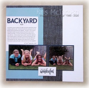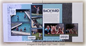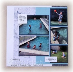 Today’s page shows off some photos taken during a recent short stay by my two youngest granddaughters. I used the same layout as the pages I shared recently which you can see here. This time I attached a piece of In Good Taste Designer Series Paper to each of the Whisper White 12″ x 12″ pages. I embossed Balmy Blue card using the Subtle 3D Embossing Folder and attached the embossed card over the Designer Series Paper. I attached an additional piece of the In Good Taste Designer Series Paper to the left hand side of the first page.