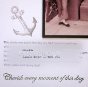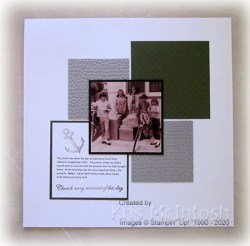 Each of the embossed squares are attached to a Whisper White 12″ x 12″ page. I printed the journaling onto Whisper White card and added the anchor image from the Sailing Home stamp set using Gray Granite ink. I also added the greeting from the Forever Blossoms stamp set using Mossy Meadow ink. The journaling panel is attached to Mossy Meadow card before it is attached to the Whisper White page. I attached the photo to Basic Black card and centred it over the attached panels.