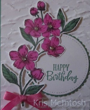 The greeting is attached to a Just Jade scalloped circle cut using the Layering Circle Dies. The greeting panel is attached to the right hand side of the embossed panel. I stamped the floral image from the Forever Blossoms stamp set onto Whisper White card using Memento Tuxedo Black ink.