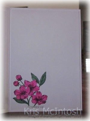 I coloured the image using the Magenta Madness and Just Jade Stampin’ Write Markers. I cut out the image using the co-ordinating Cherry Blossoms Die and attached it to the left hand side of the embossed panel using Mini Dimensionals where necessary. I tied a bow in a length of Magenta Madness 1/4″ In-Colour Ribbon and attached it over the end of the floral image using a Glue Dot. I also added some Basic Rhinestones to the flower centres. To decorate the inside of the card, I inked just the top section of the floral image from the Forever Blossoms stamp set using Memento Tuxedo Black ink and stamped it onto the lower left hand side of Whisper White card. I coloured the image using the Magenta Madness and Just Jade Stampin’ Blends.