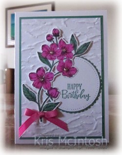I coloured the image using the Magenta Madness and Just Jade Stampin’ Write Markers. I cut out the image using the co-ordinating Cherry Blossoms Die and attached it to the left hand side of the embossed panel using Mini Dimensionals where necessary. I tied a bow in a length of Magenta Madness 1/4″ In-Colour Ribbon and attached it over the end of the floral image using a Glue Dot. I also added some Basic Rhinestones to the flower centres. To decorate the inside of the card, I inked just the top section of the floral image from the Forever Blossoms stamp set using Memento Tuxedo Black ink and stamped it onto the lower left hand side of Whisper White card. I coloured the image using the Magenta Madness and Just Jade Stampin’ Blends.
