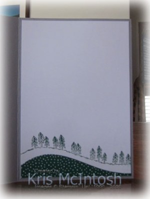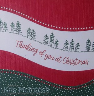 I also cut the edge of the piece of the Shaded Spruce paper from the Classic Christmas Designer Series Paper using the dotted die. I attached this panel over the Real Red panel at the bottom of the card front. The whole Whisper White panel is attached to scored and folded Smoky Slate card.