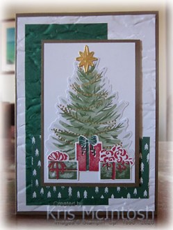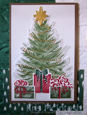 I attached the Christmas Tree die cut from the Tag Buffet Project Kit to Whisper White card and then Soft Suede card. The image panel is attached to the card front using dimensionals.