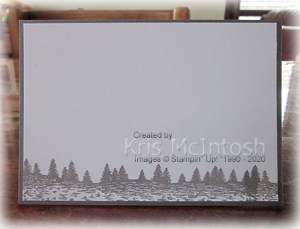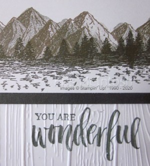 I stamped the solid mountain image from the Mountain Air stamp set onto a 5cm wide strip of Whisper White card using Smoky Slate ink. I stamped the detailed mountain image over the top of the solid mountain image using Gray Granite ink. I added the trees from the Mountain Air stamp set using Basic Gray ink. I attached the stamped panel to Basic Gray card and then the embossed Whisper White card.