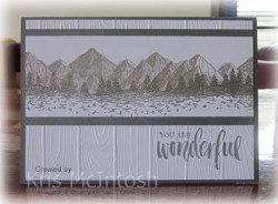 I stamped the solid mountain image from the Mountain Air stamp set onto a 5cm wide strip of Whisper White card using Smoky Slate ink. I stamped the detailed mountain image over the top of the solid mountain image using Gray Granite ink. I added the trees from the Mountain Air stamp set using Basic Gray ink. I attached the stamped panel to Basic Gray card and then the embossed Whisper White card.