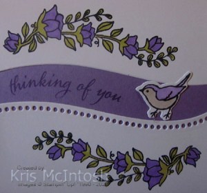 I attached the Whisper White pieces to Highland Heather card and then scored and folded Thick Whisper White card. I stamped the bird image from the Quite Curvy stamp set onto scrap Whisper White card and coloured it using the Light Crumb Cake and Light Highland Heather Stampin’ Blends. I cut out the bird using the co-ordinating Curvy Die and attached it to the card front. To decorate the inside of the card, I stamped the floral image on the top and the bottom of Whisper White card using Memento Tuxedo Black ink. The images are coloured using the Dark Highland Heather and Light Old Olive Stampin’ Blends.