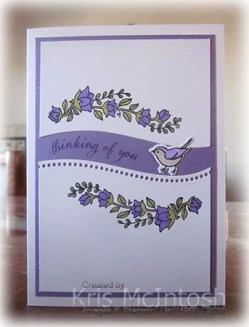 I stamped the floral image from the Quite Curvy stamp set onto the bottom left hand side of the piece without the dots and the top right hand side of the piece with the dots. I coloured the images using the Dark Highland Heather and Light Old Olive Stampin’ Blends.