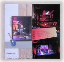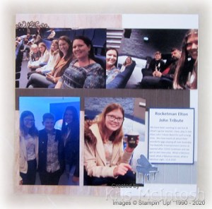 We were finally able to visit the Redcliffe Entertainment Centre and watch Dave, who gives Ron and Ethan guitar lessons, play in the Rocketman Elton John Tribute Band. What a performance! So, today’s page shows off some photos from that event. I used Whisper White 12″ x 12″ card as the base for each page and to each one I attached a piece of In Good Taste Designer Series Paper. I embossed the strips of Smoky Slate and Early Espresso card using the Pinewood Planks 3D Embossing Folder.