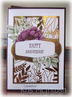 My sister and her husband celebrate their Wedding Anniversary yesterday, so I thought I would share the card I made for her with you. I attached another of the card front pieces from the Forever Gold Specialty Designer Series Paper to Whisper White card and then scored and folded Blackberry Bliss card. I cut Gold Foil card using the Tasteful Labels Dies and attached it to the card front. I stamped two of the flowers from the Tasteful Touches stamp set onto Whisper White card using Blackberry Bliss ink.