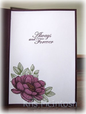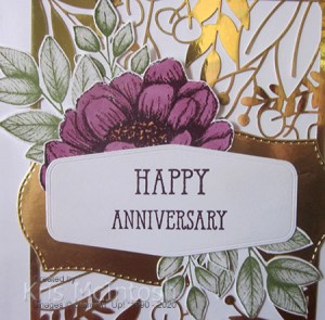 I attached a couple of leaves to the back of the flower before attaching it to the top left hand corner of the Gold Foil die cut. I added a couple of leaves to the bottom right hand corner of the Gold Foil die as well. I stamped “happy” and “anniversary” from the Well Said stamp set onto Whisper White card using Blackberry Bliss ink. I cut out the greeting using one of the Tasteful Label Dies and attached it to the card front. To decorate the inside of the card, I stamped the greeting from the Forever Blossoms stamp set onto Whisper White card using Blackberry Bliss ink. I stamped one of the leaf images from the Forever Fern stamp set twice onto the lower left hand corner of the Whisper White card using Old Olive ink. I added one more leaf which I had stamped and die cut and then the remaining flower.