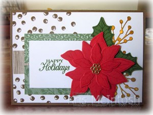 I cut Gold Foil card twice using the Poinsettia Dies which I attached to the card front along with the leaves. I used Glue Dots to attach the poinsettia petals to each other before using dimensionals where necessary to attach the flower to the card front. I cut the flower centre from Gold Foil card using the Poinsettia Die and attached it to the centre of the flower. To decorate the inside of the card, I stamped the greeting from the Poinsettia Petals stamp set onto Whisper White card using Garden Green ink. I attached a narrow strip of Soft Suede card behind one long edge of a piece of the Poinsettia Place Designer Series Paper and attached it to the bottom of the stamped card.