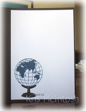 I also stamped the greeting from the Beautiful World stamp set onto the lower right hand corner of the Whisper White card using Early Espresso ink. I stamped the globe image from the Beautiful World stamp set onto Whisper White card using Early Espresso ink before attaching the panel to the card front using dimensionals. To decorate the inside of the card, I stamped the globe stand from the Beautiful World stamp set onto the lower left hand corner of Whisper White card using Early Espresso ink. I stamped the globe image onto the globe stand using Misty Moonlight ink.