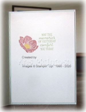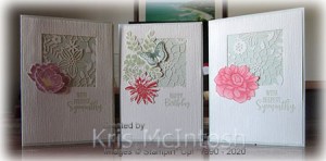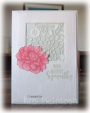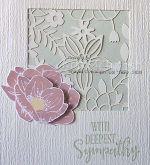 The whole piece is attached to scored and folded Soft Sea Foam card. For the first “With Deepest Sympathy” card, I stamped the two solid floral images from the Floral Essence stamp set onto Very Vanilla card using Blushing Bride ink.