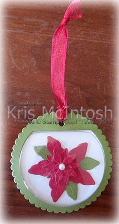 Yesterday on my Facebook Live, I shared how to make some Christmas Decorations using the Snow Globe Shaker Domes. This decoration I am sharing with you today is one I made for the ladies who support me all year in my business. I cut Real Red card using the smaller petal and the really small petal die from the Poinsettia Dies. I layered the petals on top of each other using Glue Dots. I cut the smaller petal from Old Olive card and cut it into 2 two leaf and 1 one leaf sections. I attached one two leaf and one single leaf pieces to the back of the flower. Lastly I added a large Basic Pearl. To create the decoration, I cut two of the largest scalloped circles from Old Olive card and one from Whisper White card.