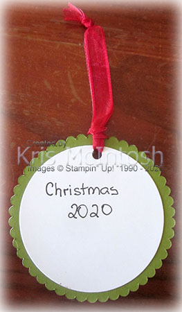 I also cut one circle from Whisper White card using the Layering Circle Dies. I cut the centre from one of the Old Olive scalloped circles using the Snow Globe Scenes Die. To put it together, I trimmed down the sides of the Snow Globe Shaker Dome (they are designed to fit behind a larger piece of card). I attached the Old Olive with the centre cut out to the front of the Shaker Dome. I attached the flower to the centre of the Whisper White scalloped circle and attached it to the back of the Shaker Dome. I attached the Whisper White circle to the remaining Old Olive scalloped circle before attaching it to the back of the Shaker Dome. I used my Crop-A-Dile to punch a hole in the top of the ornament and tied a length of Real Red 3/8″ Sheer Ribbon through the top. I like to write the year on the back of the ornament so that I can remember when it was created.