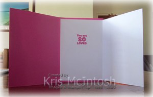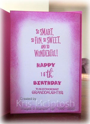 I inked each of the words separately so that I could add “16th” using the Make a Difference stamp set. Rhe last greeting also comes from the A Grand Kid stamp set. I sponged around the edges of the panel using Magenta Madness ink. I stamped “You are So Loved” from the same stamp set onto the inside of the card before attaching it inside the Magenta Madness card base.