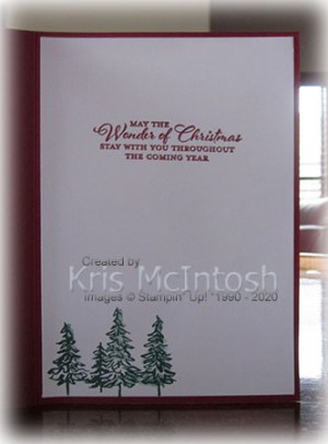 I cut out the image using one of the Stitched So Sweetly Dies and attached it to Cherry Cobbler card cut using the same Dies. The whole panel is attached to the card front using dimensionals. To decorate the inside of the card, I stamped the greeting from the Wishes and Wonder stamp set onto Whisper White card using Cherry Cobbler ink. I stamped the line of tree image from the In The Pines stamp set onto the lower left hand corner using Shaded Spruce ink and added the fill image using the same ink which I stamped onto scrap paper first. Don’t forget to check out the stamp sets that I have used on these cards. Most of them are retiring and some of them are discounted during the Mega Sale. So visit my store and check out the Giant Year-End Closeout.