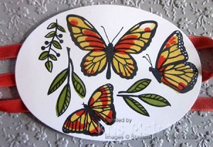 I added colour to the butterflies with So Saffron ink first and then with Calyso Coral ink to add the detail. The leaves are filled with Pear Pizzazz ink. I cut out the image using the largest oval from the Layering Ovals Dies. I added Calypso Coral ribbon from the Ornate Garden Ribbon Combo Pack to the back of the oval before attaching the panel to the card front using dimensionals. To decorate the inside of the card, I stamped “happy birthday” from the Peaceful Moments stamp set onto Whisper White card using Memento Tuxedo Black ink.
