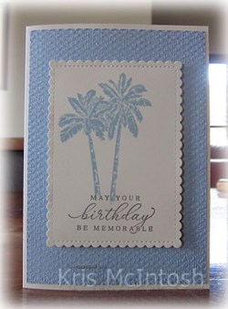 The image panel is attached to the card front using dimensionals. To decorate the inside of the card, I stamped the palm trees using Seaside Spray ink. I decided to create a second card switching up the die cutting. This time, I cut the largest Stitched So Sweetly Rectangle Die from the centre of Seaside Spray card. I embossed the frame using the Tasteful Textile3D Embossing Folder and attached it to the card front using dimensionals. I stamped the palm trees from the Timeless Tropical stamp set inside the frame using Seaside Spray ink. I also stamped the greeting from the same stamp set inside the frame using Basic Gray ink. Once more to decorate the inside of the card, I stamped the palm trees using Seaside Spray ink.