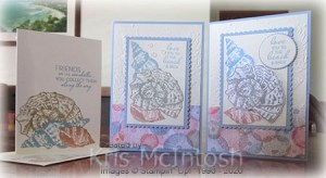 The image panel is attached to the card front using dimensionals. To finish off the card front I added 3 Opal Rounds to the image panel. To decorate the inside of the card, I stamped the seashell image from the Friends Are Like Seashells stamp set onto the left hand corner of Very Vanilla card using Seaside Spray ink. For the last card, I basically created the same card, but this time, embossing Very Vanilla card, adding the Sand & Sea Designer Series Paper and attaching to a card base of Seaside Spray.