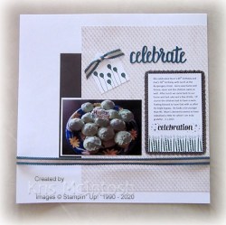 I stamped the balloons from the Approaching Perfection stamp set onto Whisper White card using Memento Tuxedo Black ink. I punched the top of the card using the Scalloped Tag Topper Punch. I coloured the balloons using the Dark Pretty Peacock Stampin’ Blend. I attached the tag to the top of the first page before adding Pretty Peacock 1/2″ Scalloped Linen Ribbon with a Glue Dot. I cut “celebrate” from Pretty Peacock card using the retired Celebrate You Dies before attaching it to the right hand side of the tag. I cut the journaling mat from Early Espresso card using the Ornate Layers Dies. The journaling is printed onto Basic White card. I stamped “celebration” from the retired Remember This stamp set below the journaling using Early Espresso ink. I stamped the candle image from the Approaching Perfection stamp set across the Basic White card below “celebration”. I stamped the balloons and the candles from the Approaching Perfection stamp set across the bottom of the right hand page using Pretty Peacock ink. I stamped the greeting from the Approaching Perfection stamp set onto Whisper White card using Pretty Peacock ink and punched it out using the Everyday Label Punch. I punched Early Espresso card using the same punch cut it in half and attached one half to the back of the top of the greeting and one half to the back of the bottom of the greeting. I attached the punched piece to the centre of the photos on the right hand page. Lastly I wrapped each page with the Pretty Peacock 1/2″ Scalloped Linen Ribbon.