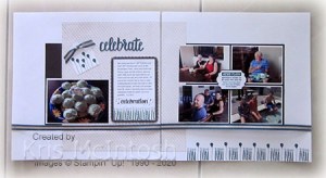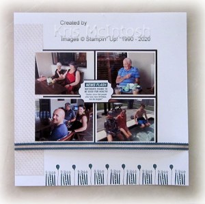 Today’s pages are dedicated to some photos from Mum and Dad’s birthday earlier in January. I attached a piece of In Good Taste Designer Series Paper to Basic White 12″ x 12″ pages. The Designer Series Paper is attached to the right hand side of the first page and the left hand side of the second page. However in the first instance I only attached the Designer Series Paper underneath the edge of the paper where it meets the edge of the Basic White page. I attached the photos to Basic White card and then Early Espresso card before attaching them to the Basic White pages. I slipped the Basic White card mats underneath the Designer Series Paper where necessary.