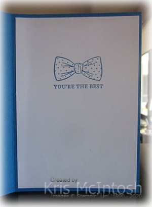 I stamped the smaller bow tie from the Handsomely Suited stamp set onto Whisper White card using Pacific Point ink. I stamped the greeting, also from the Handsomely Suited stamp set, below the bow tie using Pacific Point ink. I cut out the images using the same sized square from the Layering Squares Dies. I attached the image panel to a scalloped square cut from Pacific Point card using the Layering Squares Dies. To decorate the inside of the card, I stamped the larger bow tie image from the Handsomely Suited stamp set onto Whisper White card using Pacific Point ink. I stamped the greeting from the same stamp set below the bow tie also using Pacific Point ink.