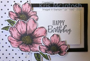 The Basic White rectangle is attached to the card front using dimensionals. I stamped one large and two small flowers from the Forever & Always stamp set onto Basic White card using Memento Tuxedo Black ink. I coloured the flowers using the Flirty Flamingo and Dark Daffodil Delight Stampin’ Blends. I stamped two large and two small leaves from the Forever & Always stamp set onto Basic White card using Memento Tuxedo Black ink and coloured them using the Dark Granny Apple Green Stampin’ Blend. I cut out the flowers and the leaves using the co-ordinating Always Dies.