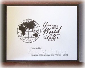 I stamped “Life’s a beautiful journey” from the Beautiful World stamp set onto Basic White card using Early Espresso ink. I used my Paper Snips to cut around the greeting and attached it over the globe base. To decorate the inside of the card, I stamped another greeting from the Beautiful World stamp set onto Basic White card using Early Espresso ink. I stamped the globe image from the same stamp set next to the greeting using Early Espresso ink.