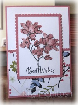 Today’s card was inspired by a layout I saw on Pinterest. I think maybe I spend too much time, looking! I cut a length of Rococo Rose Scalloped Linen Ribbon in half to give two pieces each with a scalloped edge. I attached one half behind one long edge on a piece of Paper Blooms Designer Series Paper. I attached the Designer Series Paper to the bottom of Basic White card and wrapped the ends of the ribbon around the back. The Basic White card is attached to scored and folded Rococo Rose card. I stamped the floral image from the A Touch of Ink stamp set twice onto Basic White card using Memento Tuxedo Black ink.