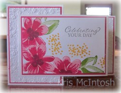 Another Z-Fold card today – I told you I was falling in love with these! I cut Thick Basic White card for the base card and attached Flirty Flamingo card. I embossed Basic White card using the Ornate Floral 3D Embossing Folder and attached the embossed pieces to the Flirty Flamingo card. I cut the Z-Fold from Thick Basic White card and attached it to the embossed panels.