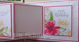I cut Flirty Flamingo card and attached it to each of the panels on the Z-Fold card. I cut Basic White card for each of the panels on the Z-Fold. For the card front, I stamped the flower from the Gorgeous Posies stamp set using Flirty Flamingo card. I covered the flower each time I stamped with a post-it-note mask so that I could sit the flowers over each other. I kept the masks in place and stamped the leaves using Granny Apple Green ink.