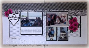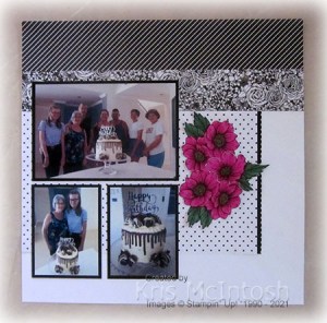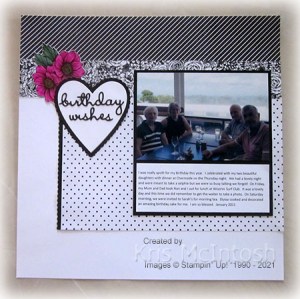 Today’s page shows off some photos taken whilst I was celebrating my birthday! I was very spoilt. Dinner out with my two beautiful daughters on Thursday, lunch on Friday with Mum and Dad and morning tea at Sarah’s with a beautiful cake cooked and decorated by Elyssa on Saturday. So lucky. I decorated the pages by attaching two strips of True Love Designer Series Paper across the top of a Basic White 12″ x 12″ page. I cut Basic Black card using the scalloped edge die from the Be Mine Dies which I attached behind one edge of another piece of True Love Designer Series Paper before attaching the paper to the page. For the title page, I coloured a flower from the True Love Designer Series Paper using Magenta Madness, Just Jade and Dark Daffodil Delight Stampin’ Blends and attached it to the upper right hand side of the page.