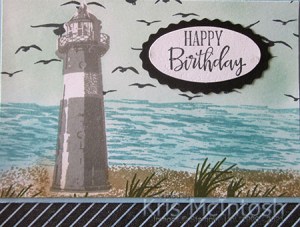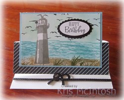 Today I am sharing another easel card which uses the High Tide stamp set. I cut the card base from Thick Basic White card and scored and folded it to create the easel. I coloured a strip of the True Love Designer Series Paper using the Dark Balmy Blue Stampin’ Blend before attaching to the lower section of the card front. I stamped the sand image from the High Tide stamp set across the bottom of Basic White card using Crumb Cake ink. I stamped the lighthouse images using Smoky Slate and Basic Gray ink. I masked the lighthouse image and stamped the sea image using Balmy Blue ink. With the mask still in place, I used a Blending Brush to add Pool Party ink to the top part of the card. I also used the Blending Brush to add a little more Balmy Blue ink to the sea.