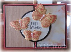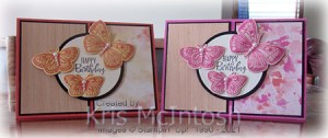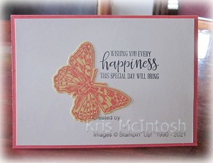 I attached the two circles together before attaching them to the card front using dimensionals. I stamped the image from the Butterfly Brilliance stamp set onto So Saffron card using Calypso Coral ink and cut out the butterflies using the co-ordinating Brilliant Wings Die. I curled the wings of three butterflies and attached them to the card front using dimensionals under the wings and glue dots in the centre of the body. Where the wings hang over the edge of the greeting panel, I stacked two dimensionals. Lastly I added Basic Pearls to the centres of the butterfly bodies. To decorate the inside of the card, I stamped another greeting from the Peaceful Moments stamp set onto Very Vanilla card using Memento Tuxedo Black ink. I attached another of the butterflies beside the greeting. This card turned out so great, I created another one using a different pattern paper from the Buttefly Bijou Designer Series Paper. I also used Blushing Bride and Magenta Madness card and Magenta Madness ink.