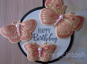 I recently saw a sketch challenge on Tuesday Morning Sketches but as happens, I missed the deadline. However, I loved the card and thought that I would share it with you. I cut a piece of Butterfly Bijou 6″ x 6″ Designer Series Paper and attached it Basic Black card. I also cut a piece of Natural Touch Specialty Paper and attached it to Basic Black card.