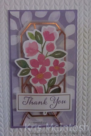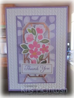 I embossed Basic White card using the one of the Greenery Embossing Folders and attached it to scored and folded Highland Heather card. I cut the back off the small note card and attached it to Highland Heather card. I attached the vellum piece using glue dots and the die cut flowers using mini dimensionals.