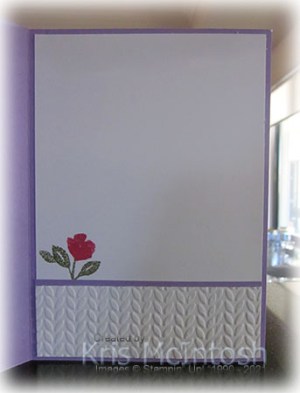 I stamped the greeting from the included stamp set onto the die cut label using Highland Heather ink. I tied a bow in the copper cord included in the kit and attached it to the back of the greeting panel. The greeting is attached using dimensionals on the ends only. To decorate the inside of the card I stamped the leaf image from the included stamp set onto the lower left hand side of Basic White card using Old Olive ink. I stamped the small flower from the included stamp set onto the leaves using Melon Mambo ink. I embossed a strip of Basic White card using the same Greenery Embossing Folder and attached a narrow strip of Highland Heather card behind one long edge. The embossed panel is attached to the stamped Basic White card.