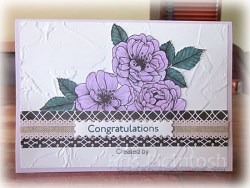 I cut out the flower and attached it to the embossed Basic White card, slipping the bottom edge of the flower underneath the strip of Designer Series Paper. I wrapped the centre of the Designer Series Paper strip with Purple Posy 1/2″ Scalloped Linen Ribbon before attaching the whole panel to scored and folded Purple Posy card. I stamped “congratulations” from the Floral Art stamp set onto Basic White card using Pretty Peacock ink. I cut out the greeting using the banner from the Floral Gallery Dies and attached it over the ribbon on the card front using dimensionals.
