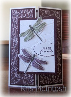 I punched the butterflies from the Dandy Garden Designer Series Paper using the Dragonflies Punch. I curled the wings and attached them to the embossed Basic White card using dimensionals under the wings and glue dots in the centre of the body. I stamped the greeting from the Dragonfly Garden stamp set onto Basic White card using Blackberry Bliss ink. I cut out the greeting using the Layering Ovals Dies and attached it to a Blackberry Bliss scalloped oval cut using the same dies. I trimmed the right hand edge straight before attaching it to the image panel. The image panel is attached to the card front using Tear & Tape underneath the left hand side only. To decorate the centre inside panel, I embossed Basic White card using the Painted Texture 3D Embossing Folder and attached it to Blackberry Bliss card. I attached Basic White card to Blackberry Bliss card to decorate the two outside panels. I cut the card mechanisms from Basic White card as well. To create the floating panels, I embossed Basic White card using the Painted Texture 3D Embossing Folder. The panels are attached to Blackberry Bliss card and then the mechanism. Once more I punched the dragonflies from the Dandy Garden Designer Series Paper using the Dragonflies Punch. This time I attached the dragonflies flat to the embossed card.