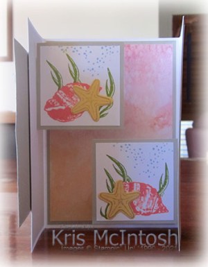 Today’s card is another Floating Gate Fold card created after watching Dawn Griffith’s video. I shared this fold with you yesterday but you can see more of my creations on my Facebook Page. I cut and scored Thick Whisper White card to create the card base. I cut two strips of Sand & Sea 12″ x 12″ Designer Series Paper and attached them to Sahara Sand card before attaching them to the front panels. I cut Sahara Sand card and Basic White card using two Stitched Rectangle Dies. I stamped the large seashell from the Friends are Like Seashells stamp set onto the Basic White rectangle using Sahara Sand ink.