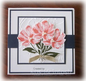 I decided to create a belly band from Night of Navy card to slide over the box. I added Basic White card which I embossed using the Painted Texture 3D Embossing Folder to Night of Navy card and then the belly band. I stamped three flower stems and three flowers from the Art Gallery stamp set as before and cut them out with the co-ordinating Floral Gallery Dies. and attached them to the embossed Basic White card again using dimensionals under one flower. I tied a knot in a length of Fine Art Ribbon and attached it over the flower stems using a Glue Dot. Lastly I added three Basic Pearls to the centre of each flower. This panel slides off easily but keeps the box nicely closed when attached.